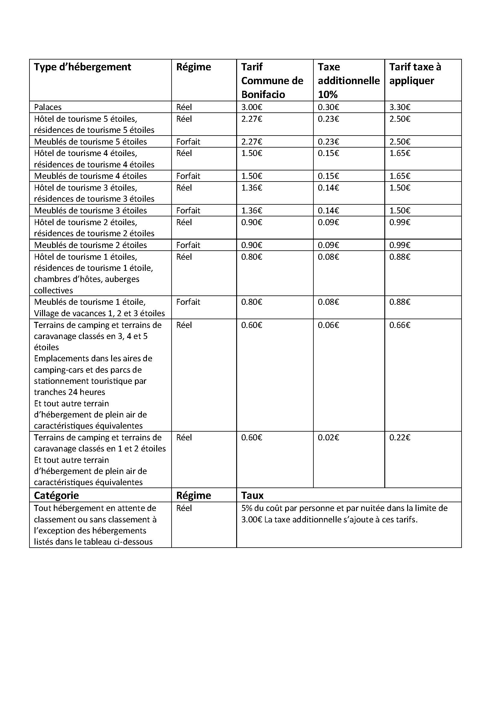 Par délibération du 20 septembre 2018, l’Assemblée de Corse a institué une taxe additionnelle de 10% à la taxe de séjour. La taxe additionnelle est recouvrée par la commune de Bonifacio pour le compte de la Collectivité de Corse dans les mêmes conditions que la taxe communale à laquelle elle s’ajoute.